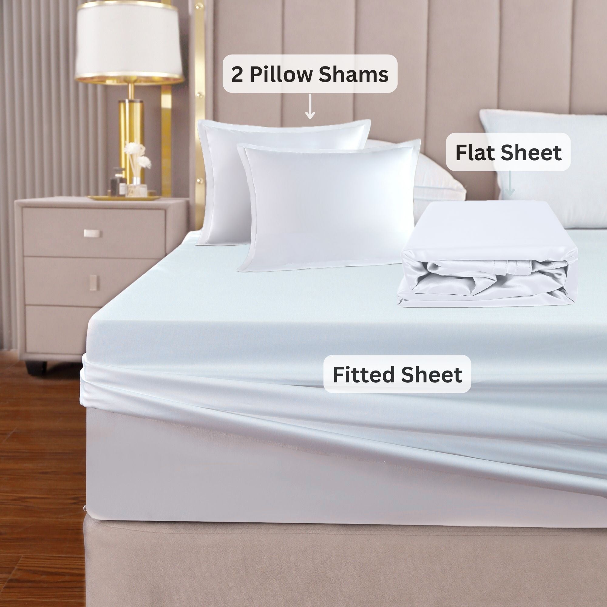 This Sheet Set Bundle includes 1 Flat Sheet, 1 Fitted sheet, and 2 pillow shams in White color.