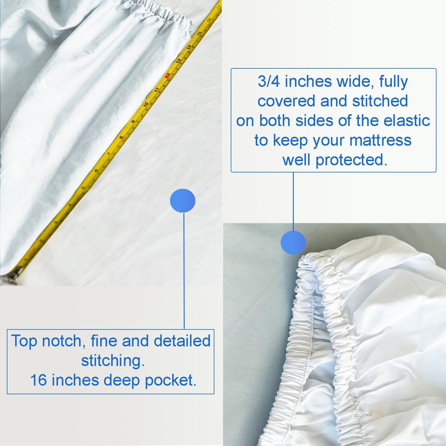Fitted Sheet: With a 16-inch deep pocket, this fitted sheet features a 3/4-inch wide elastic fully covered and stitched on both sides to ensure your mattress is well-protected.
