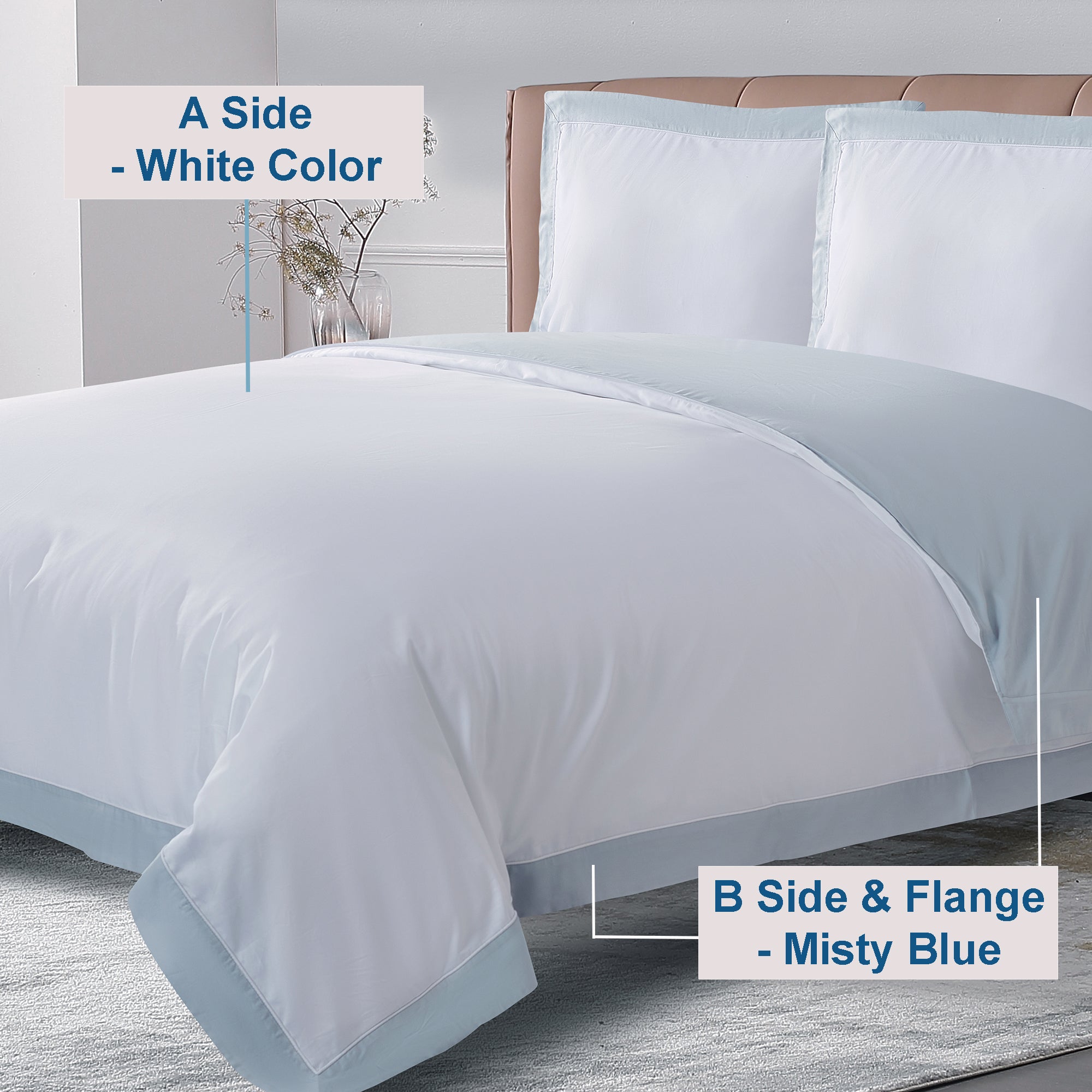 [DESIGN] The A/B sides different-color design (misty blue + white) with the white edge on the A (surface) side adds an extra elegant and luxury touch to your bedroom. Both the Duvet Cover and the two Pillow Shams have the same design.