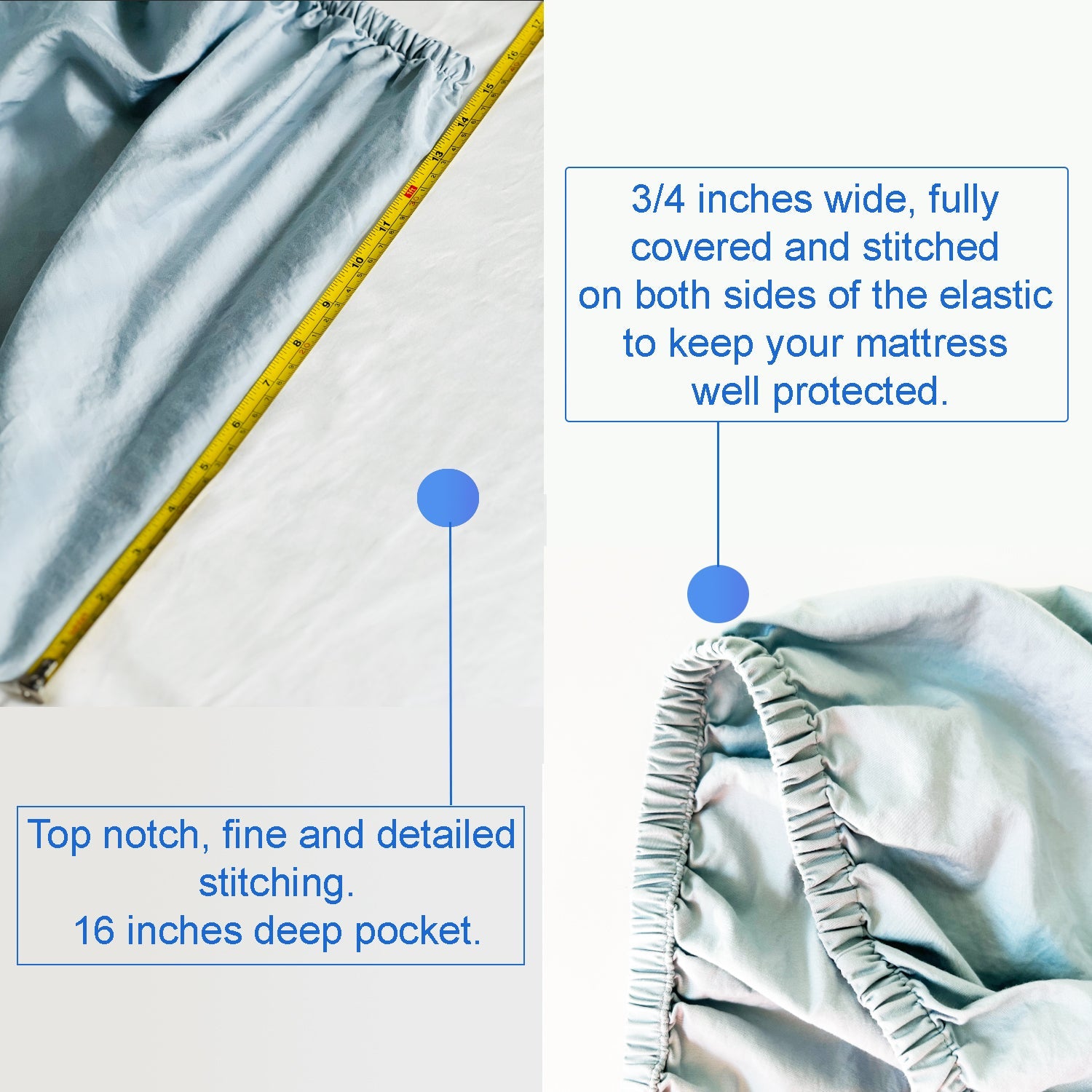 Fitted Sheet: With a 16-inch deep pocket, this fitted sheet features a 3/4-inch wide elastic fully covered and stitched on both sides to ensure your mattress is well-protected.